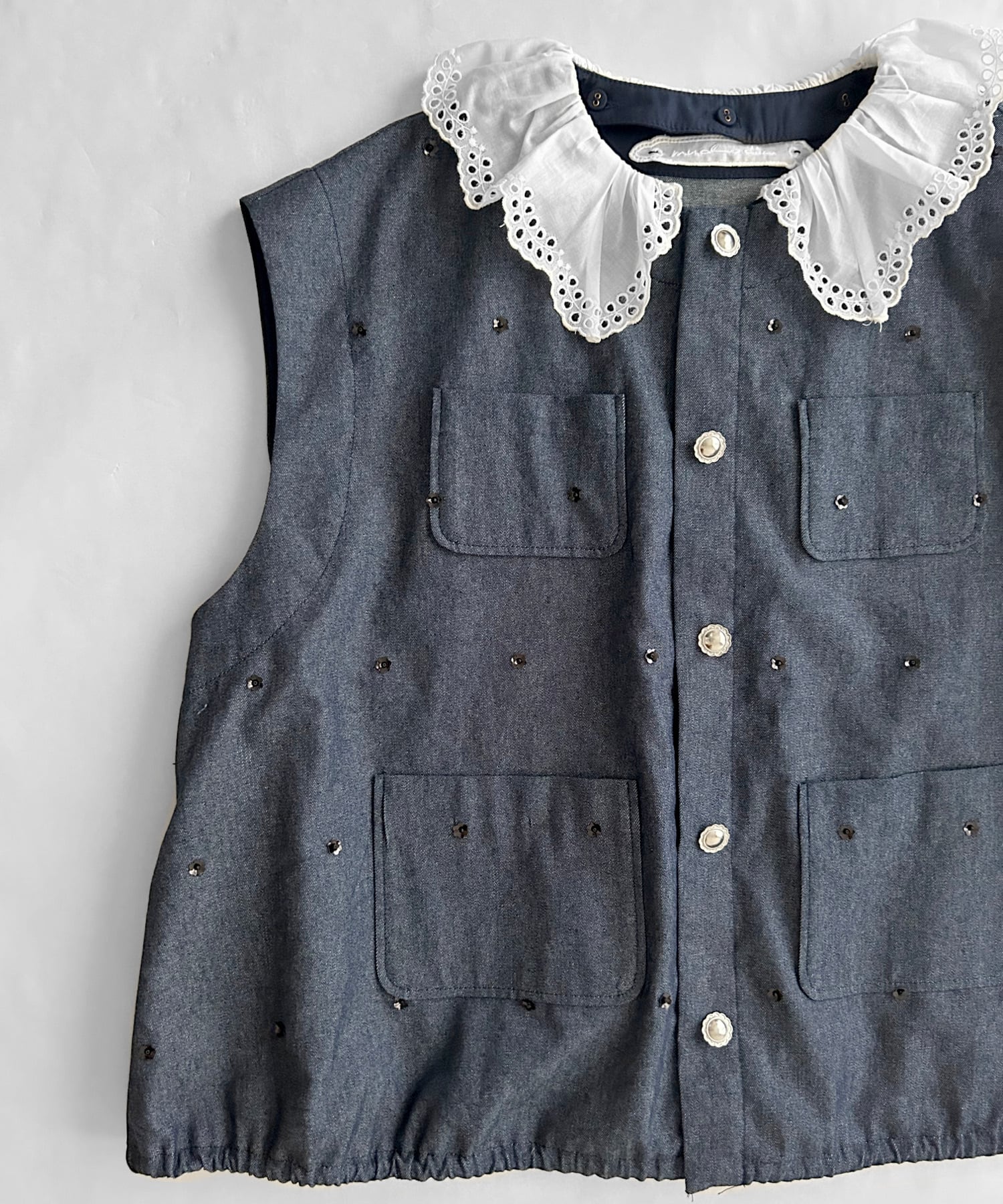 インディゴデニムに光沢感が印象的なスパンコールやシルバーボタンが映える1着。