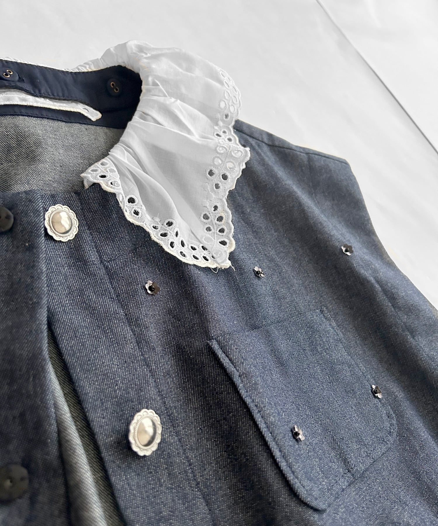 ・前あきに並んだお花のかたちのシルバーボタン(明きスナップボタン仕様)
